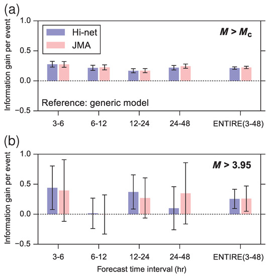 Information gain per aftershock of the forecasts based on the Hi-net and JMA catalogs, respectively, relative to the generic model for the cases with: (a) ; and (b) . If the lower bound of the error bar is greater than 0, the forecast is significantly better than the generic model with a probability larger than the . From Omi et al. [10].