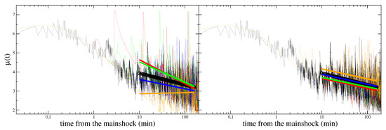 Considering the evolution of after a mainshock, occurred at the time , Lippiello et al. [16] found that the envelope function never goes below a given value which is a logarithmic decreasing function of time (Figure 8)