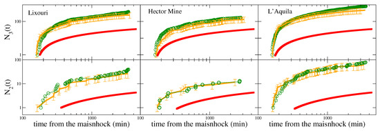 The quantities (top) and (bottom) are plotted for min as green circles for the three main-aftershock sequences of Figure 1: the 26 January 2014 Lixouri earthquake (left), the 16 October 1999 Hector Mine earthquake (middle) and the 6 April 2009 L’Aquila earthquake (right). Red squares are the expected values according to Equation (6) using the average values obtained in Reference [55]. The orange curves are the expected values using in Equation (6) the best parameters K and c inverted from the experimental fit of , and . The error bars in each plot incorporate both the uncertainty in the estimate of and fluctuations in the aftershock number for given values of and . From Reference [16].