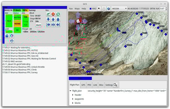 Flight planning and monitoring was accomplished using the Paparazzi software environment, which provides a graphical user interface (Paparazzi Center) to program and configure the autopilot controller firmware and user-specific flight plans. After flashing the firmware and flight plan, the UAV was ready for take-off once all pre-flight-checks were successful. Paparazzi supports three different flying modes: manual flying by remote control, no intervention of the autopilot (“manual”); manual flying by remote control, but autopilot is assisting for stabilisation of the UAV (“auto1”); autonomous flying by executing a predefined flight plan (“auto2”). The autonomous flight can be simulated and monitored in Paparazzi using the ground control station’s (GCS) graphical interface (Figure 3).