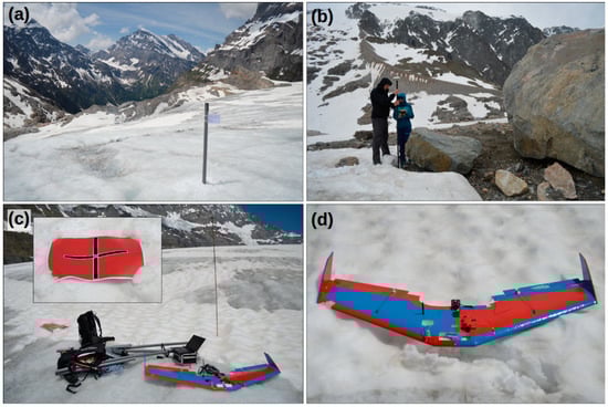 Fieldwork at the Kanderfirn. (a) Ablation stake (no. 10). (b) dGNSS measurement of a natural ground control points (GCP) in the glacier forefield. (c) Teflon marker (A2 paper size) and GCS computer. (d) Low-cost UAV.
