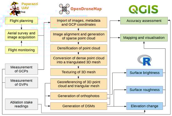 We derived five high-resolution orthophotos (5 cm) and DSMs (25 cm) of the Kanderfirn from UAV-based aerial images using the latest version (0.4.1) of the photogrammetry software OpenDroneMap (www.opendronemap.org). OpenDroneMap is a rapidly evolving community-based open-source toolkit for processing and analysing aerial imagery acquired with UAVs []. The command line program runs on all major operating systems. Different extendable web applications, such as WebODM, provide an interface to OpenDroneMap and enable data visualisation, storage and analysis []. OpenDroneMap relies on the following photogrammetry workflow to generate dense point clouds, textured meshes, DSMs and orthophotos from aerial imagery (Figure 5):