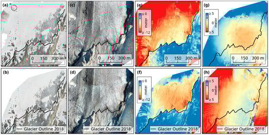 Comparison of OpenDroneMap and Pix4D outputs. (a) OpenDroneMap and (b) Pix4D orthophotos from 3 June 2018. (c) OpenDroneMap and (d) Pix4D orthophotos from 29 September 2018. (e) Elevation change over the melt season 2018 based on the OpenDroneMap DSM difference between 3 June and 29 September. (f) Elevation change over the melt season 2018 based on the Pix4D DSM difference between 3 June and 29 September. (g) OpenDroneMap and Pix4D DSM difference from 3 June and (h) 29 September 2018, respectively.
