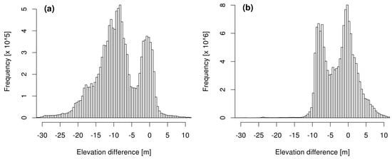 Frequency distribution of pixel values derived from the difference of the DSMs from 3 June and 29 September 2019. (a) Histogram of the OpenDroneMap DSM difference. (b) Histogram of the Pix4D DSM difference.