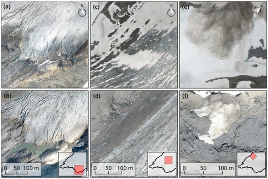 To date, most of the UAV surveys in glaciology have been performed in the polar and subpolar regions []. Despite the limited accessibility of alpine glaciers and the challenges related to flying in high-mountain environments (complex terrain, low air pressure, poor reception of GPS satellite signals, etc.), the suitability of UAVs for high-resolution glacier monitoring has been successfully demonstrated in the Alps [,,,] and the Himalaya [,,,] in recent years.