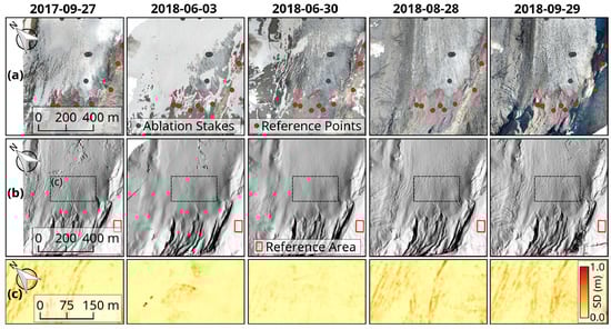 Besides the quality of the aerial images, the number of GCPs, the accuracy of dGNSS measurements, etc. [], the quality and accuracy of the orthophotos and DSMs is subject to the applied photogrammetry software. Since OpenDroneMap has not been extensively evaluated yet, we also computed orthophotos and DSMs for the beginning and end of the ablation season 2018 using the well-established photogrammetry software Pix4D []. To assess the differences of both software products, we compared the overall accuracy (RMSE) and quality (e.g., surface texture) of the different datasets.