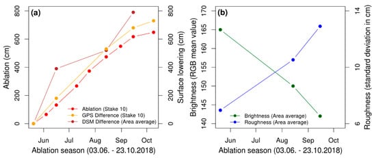 Glacier surface changes over the melt season 2018. (a) Ablation and GPS surface elevation changes measured directly at stake no. 10 (see Figure 1). Mean surface elevation changes within the comparative area (see dashed rectangle in Figure 9b) derived from OpenDroneMap DSMs. (b) Surface brightness and roughness changes within the comparative area derived from consecutive OpenDroneMap orthophotos and DSMs. Brightness and roughness data from 30 June were not considered due to differing illumination conditions caused by cloudiness.