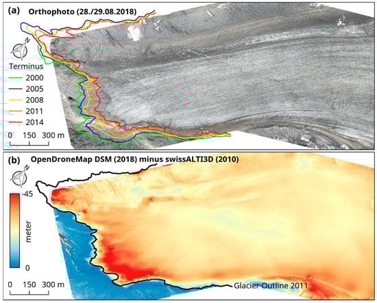 (a) High-resolution (5 cm) OpenDroneMap orthophoto of the Kanderfirn from 28–29 August 2018 based on 850 aerial images. Five orthomosaics of the Swiss Federal Office of Topography from 2000, 2005, 2008, 2011 and 2014 served for mapping changes of the terminus. (b) Glacier surface elevation change (in meters) between 2010 and 2018 based on the difference of two DSMs (OpenDroneMap DSM 2018 minus swissALTI3D 2010).