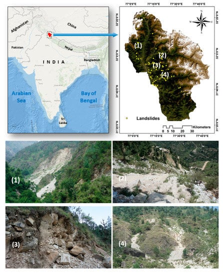 Map shows the location of the study area and the field photographs showing active landslides. (1) Phallan (2) Jallu (3) Kandi (4) Devgarh Gohi.