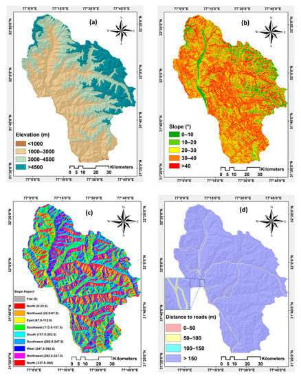 The three different spatial resolution (12.5 m, 30 m and 90 m) DEMs were used for deriving the slope angle, aspect and elevation. The slope angle is one of the most critical factors of the slope stability assessment in any LSM study []. The slope angle is directly linked to the landslides, and higher the slope angle is more susceptible to failure. The slope map was divided into five slope categories from 0° to >40° by intervals of 10°.