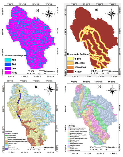 Lithology is a crucial factor controlling the landslides as various lithological units have varying geological strength parameters, permeability and susceptibility to failure []. There are fourteen lithological units in the stud area, and the layer was prepared based on the quadrangle maps from the Geological Survey of India (GSI) at 1:250,000 scale. The lithological units present in the study area are biotite schist, kynite gneiss; glacio-fluvial deposits; granitic-gneiss and granitoid; micaceous sandstone; pale white to green quartzite; pebbly siltstone; phyllite quartzite, basic flows; quartzite schist; slate phyllite; sreaky banded gneiss; wangtoo granite; phyllite; phyllite schist; purple limestone.