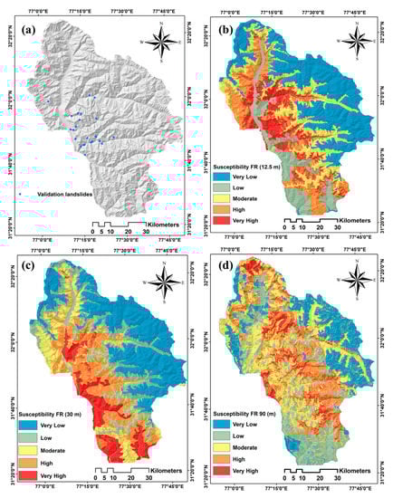 Landslide susceptibility maps resulting from the FR model based on three different resolution DEMs: (a) Landslide validation points used for accuracy assessment (b) Advanced Land Observing Satellite-1 (ALOS) Phased Array type L-band Synthetic Aperture Radar (PALSAR) (ALOS-PALSAR) 12.5 m, (c) Advanced Spaceborne Thermal Emission and Reflection Radiometer (ASTER)-Global 30 m and (d) Shuttle Radar Topography Mission (SRTM) 90 m.