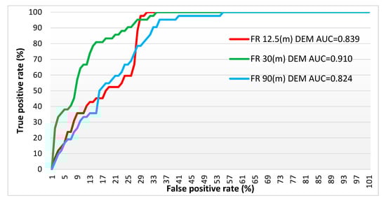 The validation section is an essential part of modelling natural hazard susceptibility to predict possible future events []. This is a critical process to predict the accuracy of future landslide events. To find the success of the FR model, we use the resulting LSM with the inventory data from the study area. This gives an estimation of the effectiveness of the model used for the LSM and if the model is optimal for the study area and the analysis. In this research, we used 30% (#45) of the landslide inventory for validation. The evaluation of the conformity between landslide inventory data and the resulting susceptibility maps of the applied DEMs can give a clear understanding of the suitability of each resolution of DEM for susceptibility mapping.