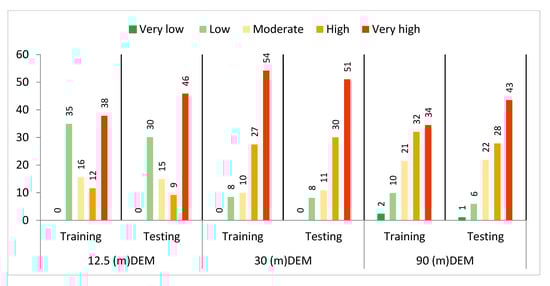 R-index in susceptibility classes for the three different resolution DEMs based on training and testing data.