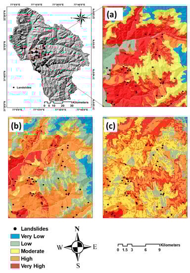 An enlarged sub-area from the resulting landslide susceptibility maps generated based on the three different resolution DEMs: (a) 12.5 m DEM, (b) 30 m DEM and (c) 90 m DEM.