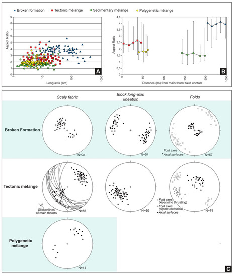 Diagrams showing block characteristics and rock fabric in different types of mélanges: (A) aspect ratio (block long axis/short axis) vs block long axis; (B) aspect ratio vs. location of chaotic units (i.e., distance from the thrust faults). Data are plotted as means with 95% error bars indicated; (C) mesoscale data (Schmidt net, lower hemisphere) of scaly fabric, lineation of the long axis of the blocks, and folds of broken formation, tectonic mélange, and polygenetic mélange.