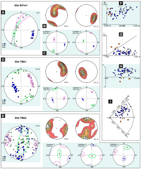 Tectonic fabric of tectonic mélange specimens: (A) stereoplots (lower-hemisphere projections) showing the shapes and attitudes of the magnetic susceptibility ellipsoids from the broken formation (site BrFm1); (B) density diagrams of k1 and k3 axes (contour interval = 10) and (C) relative subfabrics; tectonic mélanges, site TMé1 (D) and Site TMé2 (E), AMS data. Whole diagrams for the measured tectonic fabric in which orange, white, and blue squares are respectively BrFm1, TMé1, and TMé2 data: (F) anisotropy degree vs mean susceptibility; (G) magnetic lineation vs. magnetic foliation; (H) shape parameter vs. corrected anisotropy degree; (I) π/4 segment polar plot (see [103]), in which Pj represents the radius and T the arc length.