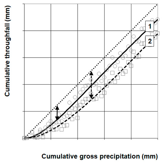 Scheme of potential relationships between gross precipitation and throughfall within the stand (potential datasets: ○ or □). Interception may be understood as the difference between gross precipitation and throughfall (arrow), when canopy storage capacity is reached. Depending on the phenological situation and the canopy features within the stand, higher or lower values of interception are possible (line 1: leafless period beneath tree crown, line 2: leafed period beneath tree crown, dotted 1:1-line: large gap or open field) at measurement points within the forest stand. Deviations in slope from values of 1 indicate lateral flow of water within the canopy (not shown, see [39]).