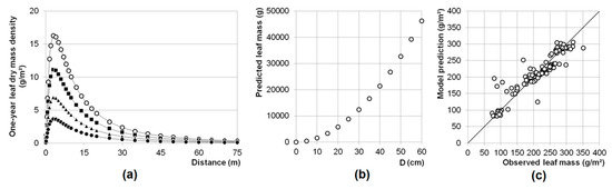 (a) Isotropic beech leaf dry mass density dispersal model (leaf dispersion modelled for various tree D ● 25 cm, ▲ 35 cm, ■ 45 cm, ○ 55 cm) and (b) D related leaf mass model. (c) Correlation plot for observed and predicted leaf litter dry masses. Details on the parameter of the final model are presented in Table 4.