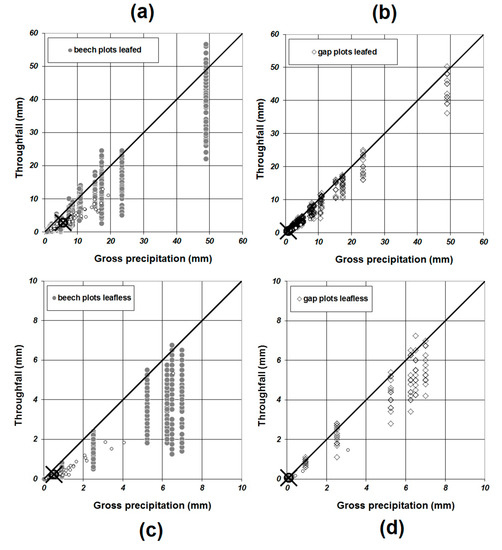 Observed relationship between the amount of throughfall and gross precipitation in foliated ((a,b), already shown in [39]) and leafless period (c,d) (note changes in the scale of the x-axis of plots of leafless and foliated periods), respectively. Different strata of plots are indicated by symbols (● beech plots: left, ◊ gap plots: right). Fitted values of parameter a for each measurement point are shown by symbol ○, and the strata average of the relationship between the amount of throughfall at gross precipitation value needed for the saturation of SC is represented by the symbols X &○.