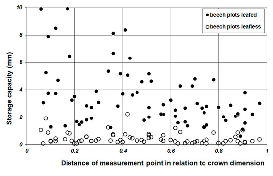 Point specific storage capacities under leafless beech crowns (SCtwig) differed between 0.06–2.21 mm and were independent of the location below the beech canopies (Figure 5). Average SCcanopy of leafless beech crown sectors (SCtwig) amounts to 0.44 mm (+/−0.41 mm SD). Average SCcanopy for measurement points below foliated beech crowns amounts to 3.43 mm (+/−2.09 mm SD) with a minimum of 0.6 mm and a maximum of 9.9 mm. SCcanopy decreases with increasing relative distance to the tree bole (p = 0.000). The relatively high values for SCcanopy (≥6.0 mm) were all located at the inner part of the crown with relative distances below 0.43. The difference between SCcanopy and SCtwig provides an estimate of respective SCleaf. For beech, mean SCleaf amounts to 2.9 mm (+/−1.9 mm SD) with a minimum of 0.0 and a maximum of 9.0 mm. The linear mixed-effects model revealed a significant decrease (p = 0.000, R2 = 0.828, AIC = 156.8, Equation (5)) in SCleaf on a balanced subsample (n = 45) from the inner part of the crown near the bole (SCleaf: mean = 4.89 mm +/−0.59 SD) towards the crown edge (SCleaf: mean = 1.11 mm +/−0.73 SD).