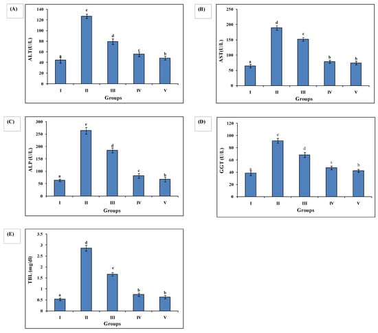 AAE maintained reduced levels of various biochemical parameters in Groups III and IV. (A) ALT (U/L), (B) AST (U/L), (C) GGT (U/L), (D) ALP (U/L), (E) TBL (mg/dL). All biochemical parameters were reversed by the test drug (AAE) administration in Groups III and Group IV, close to sylimarin-treated Group V, while Group II showed elevated levels. Duncan’s multiple-range test (DMRT) was used for the analysis of a significant difference between the means (p < 0.05) and compared each parameter. Bars with the same letters are not significantly different. All values are means of five replicates ± SD.