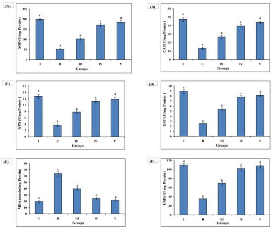 AAE treatment improves antioxidant enzyme activity and lowers lipid peroxidation. Higher antioxidant enzymes activities (A) SOD (U/mg protein), (B) catalase (U/mg protein), (C) GPX (U/mg protein), (D) GST (U/mg protein) (E) LPO (nmoles/mg protein) (F) GSH (U/mg protein) and lowered stress marker declined in AAE-treated Groups III and IV, where values of Group IV were close to those of silymarin-treated Group V. Group II had the lowest antioxidant activities and highest lipid peroxidation. Duncan’s multiple-range test (DMRT) was used for the analysis of a significant difference between the means (p < 0.05) and separately compared each parameter. Bars with the same letters are not significantly different. All values are means of five replicates ± SD.