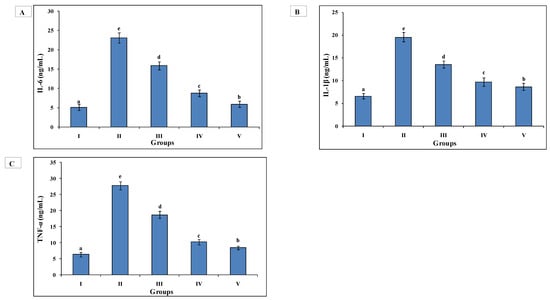 Increased levels of IL-6 (23.121 ± 1.305), IL-1β (19.554 ± 1.032) and TNF-α (27.744 ± 1.247) were found in Group II animals as compared to Group I IL-6 (5.132 ± 0.861), IL-1β (6.567 ± 0.575) and TNF-α (6.343 ± 0.658). The increased levels of these markers were reversed back in the AAE-administered Group III, IL-6- (15.895 ± 1.068), IL-1β, (13.575 ± 0.787) and TNF-α (18.683 ± 1.150), and Group IV IL-6- (8.812 ± 0.847), IL-1β, (9.675 ± 0.896) and TNF-α (10.243 ± 0.866). Group IV exhibited significant restoration, as in Group V IL-6 (5.913 ± 0.795), IL-1β (8.667 ± 0.805) TNF-α (8.434 ± 0.561) (Figure 4).
