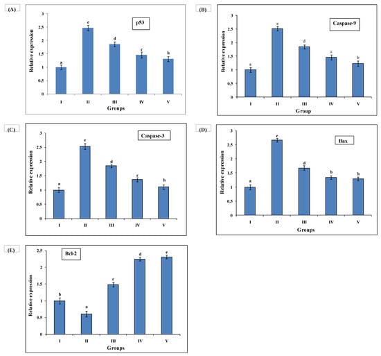 Relative expression of antiapoptotic and proapoptotic genes by qRT-PCR under MSG-induced liver toxicity. Relative expression of proapoptotic genes (A) p53, (B) caspase-9, (C) caspase-3, and (D) Bax was downregulated in all treatment groups as compared to Group II, and (E) expression of antiapoptotic gene Bcl-2 was upregulated. Duncan’s multiple-range test (DMRT) was used for analysis of a significant difference between means (p < 0.05) and separately compared each parameter. Bars with the same letters were not significantly different. All values are means of five replicates ± SD.