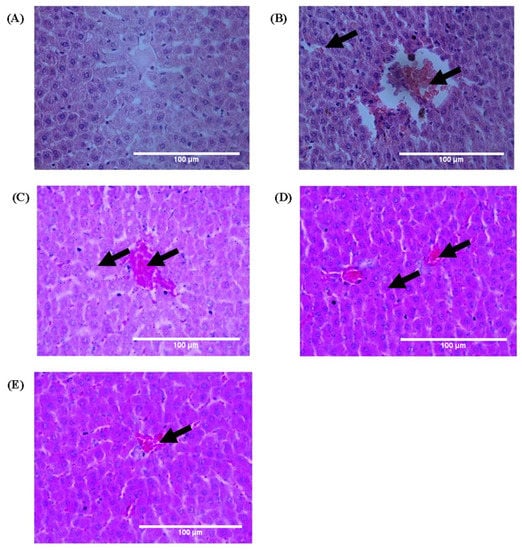 Histopathological examination of the liver section was observed with a microscope at 40X. H&E-stained liver section of Group I animals showed normal cell morphology with clear cellular boundaries, nucleus, and nucleolus with well-preserved granulated cytoplasm. No steatosis or inflammatory cells were observed compared to ethanol-intoxicated Group II animals’ liver sections. Ethanol-intoxicated animals in Group II exhibited a disarrangement of hepatocytes and number of inflammatory cells with cellular degeneration having centrilobular necrosis (Figure 6B). AAE-administered Groups III and IV showed improved hepatocyte architecture, reduction in inflammatory cells, and necrosis with clear nucleus and nucleolus, as in silymarin-treated Group V (Figure 6).