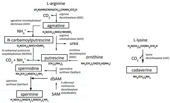 - Suzuki, H.; Kurihara, S. Polyamine Catabolism in Prokaryotes. In Polyamines: A Universal Molecular Nexus for Growth, Survival, and Specialized Metabolism; Kusano, T., Suzuki, H., Eds.; Springer: Tokyo, Japan, 2015; pp. 47–59. [Google Scholar]