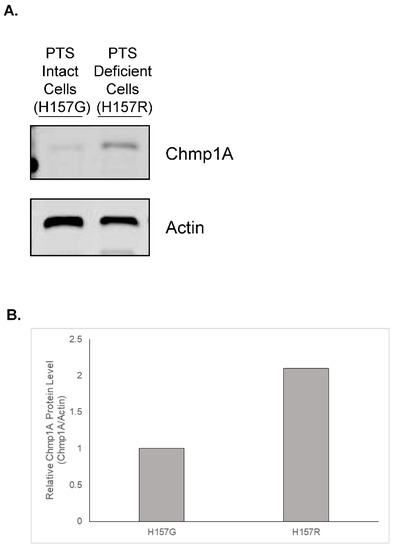 Chmp1A protein is increased in PTS-deficient H157 cells when compared to PTS intact H157 cells. Total protein from NCI H157 cells with intact PTS (denoted as H157G) or deficient in the PTS (denoted as H157R) was harvested. Chmp1A protein levels were assessed via Western blot analysis and Actin was used to normalize protein levels. This was done in duplicate with reproducible results. (A) A representative image is shown. The original western blots were provided as Figure S1. (B) Western blot quantitation. The relative Chmp1A protein density was normalized to Actin and is shown as fold change when compared to H157G cells.