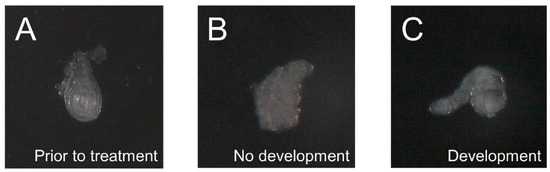 Leg imaginal discs dissected from Chmp1-overexpressing Drosophila melanogaster do develop in the presence of 20-hydroxyecdysone. (A) Depiction of a representative leg imaginal disc that was dissected from MJ33a-Gal4 > Chmp1 (Chmp1-overexpressing) wandering 3rd instar larvae immediately following dissection, (B) after 18 h at 25 °C in the absence of 20-hydroxyecdysone showing a disc that is not developed, and (C) after 18 h at 25 °C in the presence of 20-hydroxyecdysone showing a disc that is developed.