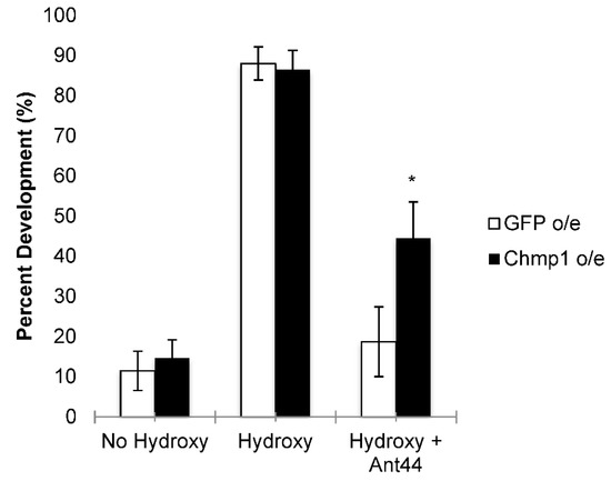 Chmp1 was overexpressed in imaginal leg discs using MJ33a-Gal4, a Gal4 line previously shown to express ubiquitously in leg imaginal discs, and compared to GFP-overexpressing controls [29]. Imaginal discs were dissected from GFP- and Chmp1-overexpressing larvae and incubated with 20-hydroxyecdysone (Figure 2) [22]. The overexpression of Chmp1 was not lethal as the imaginal discs developed normally when in the presence of 20-hydroxyecdysone. The percent development of the imaginal discs in the Chmp1-overexpressing larvae was the same as the GFP-overexpressing control larvae suggesting that the overexpression of Chmp1 did not alter leg development under normal conditions (Figure 3). The development of harvested leg imaginal discs was then assessed in the presence of Ant44, a drug known to enter the cell via the PTS and prevent leg imaginal disc development (Figure 3) [22,23]. Interestingly, larvae that overexpress Chmp1 showed a 2-fold increase in leg development when compared to the controls. These data suggest that Chmp1 overexpression inhibits the uptake of Ant44, a cytotoxic compound known to enter the cell via the PTS, implying that Chmp1 is involved in the PTS in Drosophila.