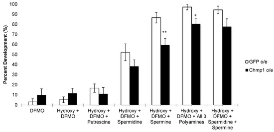 Chmp1 overexpression alters the ability of polyamines to rescue imaginal disc development in the presence of DFMO. Leg imaginal discs were dissected from MJ33a-Gal4 > GFP (GFP-overexpressing, denoted GFP o/e) and MJ33a-Gal4 > Chmp1 (Chmp1-overexpressing, denoted Chmp1 o/e) larvae. Discs were incubated for 18 h at 25 °C in the presence or absence of 20-hydroxyecdysone (hydroxy), 10 mM DFMO, and either 200 µM putrescine, 200 µM spermidine, 200 µM spermine, 200 µM all three polyamines or 200 µM spermidine and 200 µM spermine. The development of discs was scored and the percentage of disc development was recorded for each experiment. The data are shown as the mean ± SEM (n = 9–26). * p < 0.05; ** p < 0.01 using a student’s t-test comparing GFP o/e to Chmp1 o/e.