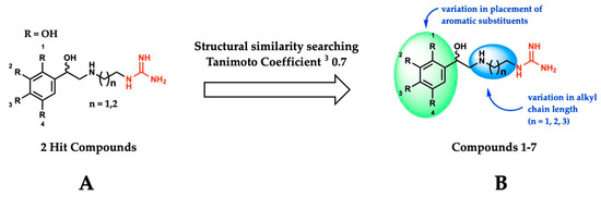 (A) General structure of hit compounds selected for further analysis from initial enzymatic screen and used for structural similarity searching. (B) Structural variation of guanidine-based hit compounds identified through initial enzymatic screening and structural similarity searching, resulting in compounds 1–7.