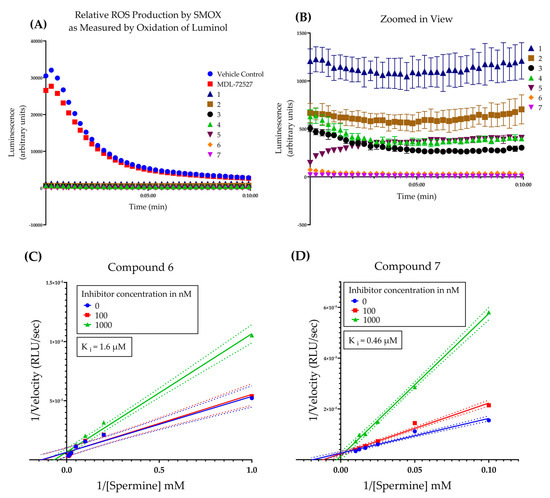 (A) Time course of the oxidation of spermine by SMOX as measured by hydrogen peroxide production coupled to HRP catalyzed oxidation of luminol over 10 min. All compounds (1–7) were assayed in triplicate at a concentration of 20 μM. Compounds were not pre-incubated with enzyme prior to reading. Luminescence was compared to vehicle control (shown in red) and MDL-72527 (shown in blue). Assay conditions: 0.083 M glycine buffer, pH = 8, 0.3 µg/mL of purified SMOX enzyme, 2 mM of spermine substrate, 25 °C. (B) Zoomed in view of data from panel A for compounds 1–7. (C) Lineweaver–Burk plot of compound 6 across three doses (0, 0.1, and 1 µM) and varying concentrations of substrate [spermine] Ki = 1.6 µM. All R2 values for kinetic analysis were >0.98. (D) Lineweaver–Burk plot of compound 7 across three doses (0, 0.1, and 1 µM) and varying concentrations of substrate [spermine] Ki = 0.46 µM. All R2 values for kinetic analysis were > 0.98.
