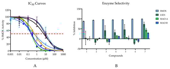 (A) IC50 values for hit compounds. Points are reported as mean % activity ± SD of triplicate values (AUC integrated over 60 s and normalized to vehicle control). Continuous line represents non-linear regression curve calculated in GraphPad Prism ([Inhibitor] vs. normalized response, variable slope, and least squares fit. (Compound 1 IC50 = 10.59 µM; Compound 2 IC50 = 8.30 µM; Compound 3 IC50 = 6.02 µM; Compound 4 IC50 = 0.23 µM; Compound 5 IC50 = 0.47 µM; Compound 6 IC50 = 0.54 μM; Compound 7 IC50 = 0.23 µM). For all reported values, R2 ≥ 0.95. (B) Enzyme selectivity for related FAD dependent amine oxidase enzymes at 20 µM.