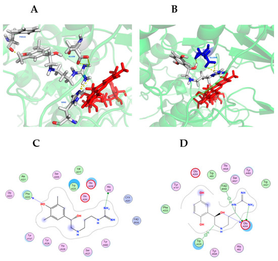 Hit compounds 6 (A) and 7 (B) in the binding-pocket of a SMOX homology model used for in silico screening. FAD is represented in red. The proposed docking conformation displays polar contact interactions (yellow) for 6 with PHE222, GLU208 and HIS82, and for 7 with GLU208. Panels C and D are graphical representations of SMOX homology model amino acid interactions for hit compounds 6 (C) and 7 (D) in their lowest energy docking pose.