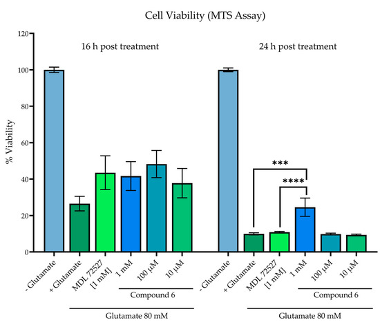 As this directly aligns with the effects of SMOX upregulation, the compounds were assessed for the ability to inhibit cytotoxicity in SH-SY5Y neuroblastoma cells exposed to glutamate (Figure 9). Cell viability was assessed by an MTS assay in SH-SY5Y neuroblastoma cells following 16- and 24-h incubation with 80 mM of glutamate and compound 6. A glutamate concentration of 80 mM was chosen because this is the published Lzc50 for glutamate in SH-SY5Y cells [45,46,47]. Glutamate treatment significantly decreased cell viability at both 16 and 24 h in comparison to untreated control wells, which were designated as 100% viability (p < 0.0001). While all treatment groups resulted in higher measured viability than vehicle control at 16 h, particularly treatment with 100 µM of compound 6 (26.5% vs. 48.3% viability), statistical significance was not achieved. At 24 h incubation, treatment with compound 6 at a concentration of 1 mM significantly increased cell viability in comparison to both vehicle control (p = 0.0001) and MDL 72527 (p = 0.0003).