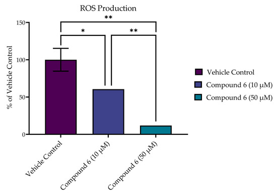 In addition to improved viability at 24 h, compound 6 reduced the production of ROS in SH-SY5Y cells following acute excitotoxic stress (8.0 mM of glutamate exposure) in a dose-dependent manner, as measured by CM-H2DCFDA at 1 h post treatment (Figure 10). Treatment with both 10 µM and 50 µM of compound 6 significantly decreased the production of ROS in comparison to the vehicle control (p < 0.0001). In addition, a dose-dependent effect was seen, with the higher dose (50 µM) achieving a significant reduction in ROS over the 10 µM dose (p = 0.0004).