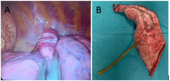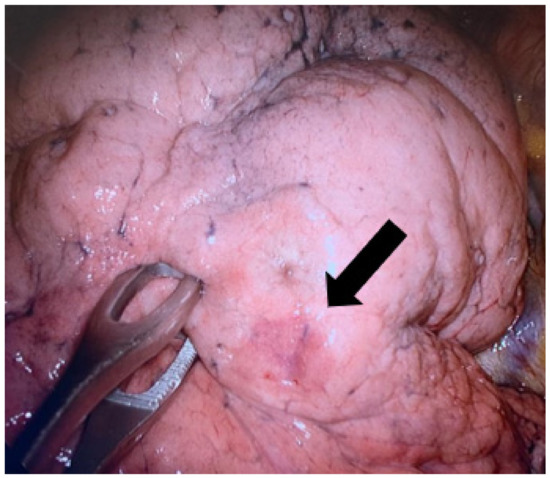 After the radiological procedure, a patient was returned ito the ward and surgery was scheduled for the same day of plug deployment, though at least 3 h later (the time required for the plug’s expansion). We performed a uniVATS procedure under general anesthesia according to Gonzales Rivas’ approach [28]. After the lung collapse, visceral pleura were carefully inspected until direct visualization of the hydrogel plug was confirmed. Once the marked lesion was identified, a large-ring forceps was used to remove the lesion with the surrounding lung parenchyma with a margin distance of 2 cm and a wedge resection was performed (Figure 3). All lung specimens underwent frozen section examination in order to assess the lesions’ excision and its nature (benignant vs malignant). If a malignant cancer was confirmed, we proceeded to a major lung resection, and the type of resection (segmentectomy or lobectomy) depended mainly on the site of the lesion, as well as the percentage of solid component of the lesion (segmentectomy if it was less than 50% of the GGO). The study’s end points were the rate of intraoperative localization of marked lesions and the rate of successful uniVATS resections.