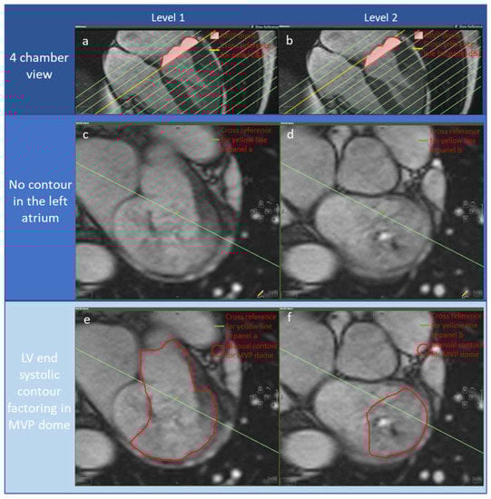 Papillary muscles were manually excluded from the LV volume. LVESV, LVEDV, and LV SV were recorded. In the first group, LV SVstandard was obtained (LV SVstandard = LVEDV – LVESV) thus excluding MVP left ventricular doming volume. In the second group, MVP left ventricular doming volume was included in LV SV assessment (LV SVMVP) by manually drawing contours where AI failed to factor in MVP left ventricular doming volume (Figure 1c,d).