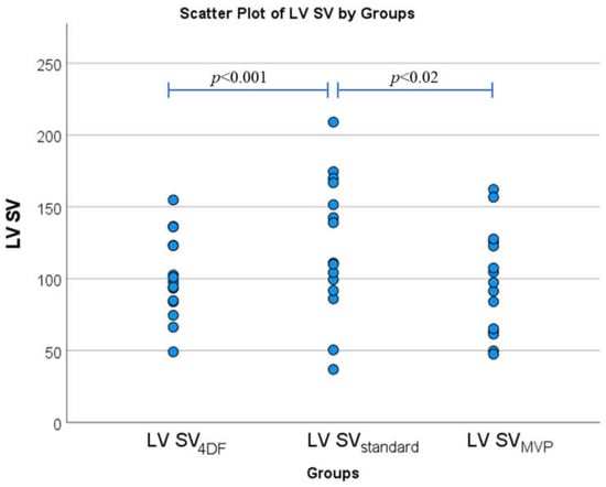 Descriptive statistics for the recorded parameters are presented in Table 2. LV SVstandard was significantly greater than either LV SVMVP and LV SV4DF (Figure 2) with p < 0.001 and p = 0.02, respectively. No difference was observed between LV SVMVP with LV SV4DF (p = 0.6). The ejection fraction in the LV SVMVP group was significantly lower than the LV SVstandard group (52% ± 11% vs. 61% ± 14%, p < 0.001).