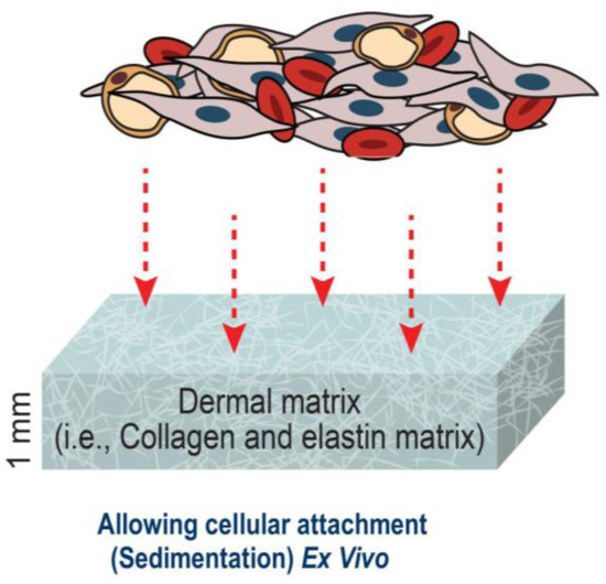 We have previously shown that smaller cannulas resulted in higher viability of ASCs than bigger cannulas [12]. Moreover, in previous publications, the successful ex vivo integration of ASCs into collagen–elastin matrices after a 3 h incubation period—and, more interestingly, even at 1 h—has been proven. This time was sufficient for integration, confirming that it is possible to manufacture a construct ex vivo. Therefore, we hypothesized and proposed the formation concept of the so-called Lipoderm (Figure 3) [1].
