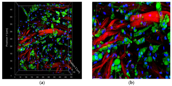 (a,b): Two-photon microscopy image of a collagen–elastin matrix incubated with freshly isolated ASCs after 1 h. The cytoplasm of viable cells (represented in green) was stained using fluorescein diacetate. The cell nuclei (represented in blue) were stained using Hoechst 33,342. Finally, the red color represents the collagen–elastin matrix (100 μm scale).