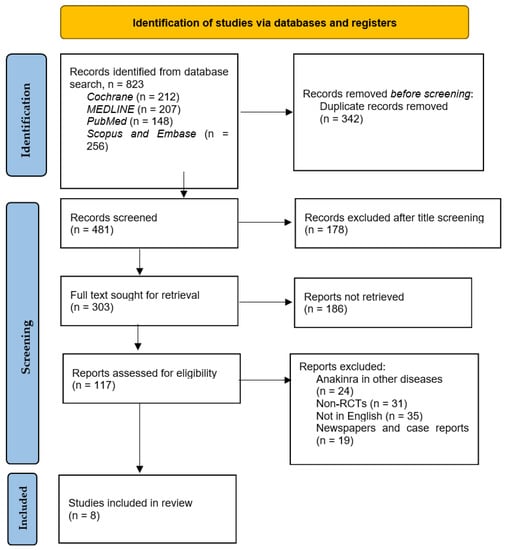 The total citations identified through the various databases in addition to reviewing their reference lists included 823 articles. Of these, only eight studies were RCTs meeting the inclusion criteria, namely exploring the effect of anakinra on HFrEF, and were acquired for analysis. Duplicates were 342 in number, and 178 were excluded after title and abstract screening, and 186 studies were not retrieved due to the requirement of purchase and special licenses needed for access and also due to URL errors during searching for their full texts. Figure 2 below depicts the search process used to select the eight pertinent articles for this study. Table 1 depicts the outcomes of the use of anakinra in HF that were evaluated in various trials and those included in this systematic review.