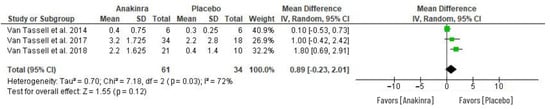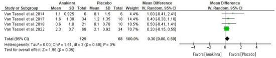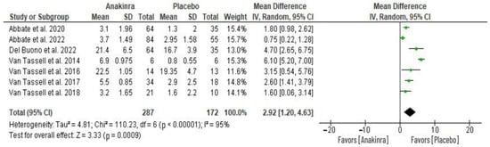 Seven RCTs evaluated the impact on C-reactive protein (CRP) levels caused by anakinra treatment. The changes in the level of CRP from baseline were used to perform a meta-analysis of the seven RCTs as depicted in Figure 5. This analysis reveals a significant difference in CRP levels between the two groups, with anakinra treatment showing a significantly higher reduction from the baseline CRP level compared to placebo treatment (MD 2.17, 95% CI 1.81 to 2.53; I2 = 95%) at p = 0.0009. The overall heterogeneity across the seven studies was significantly high, with I2 = 95%.