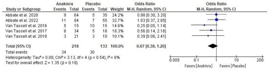 Furthermore, this study evaluated adverse events as treatment-related side effects of anakinra. Among the AEs were injection-site reactions [27], serious and non-serious sinus and respiratory infections [31], events of ischemic or hemorrhagic stroke [30], and worsened pulmonary congestion [26]. The high rate of readmissions and longer hospitalizations can be articulated along with these adverse events, which may result in deaths among HF patients if not well-managed [27]. Our study indicates that there was a smaller number of patients with adverse events in the anakinra-treated group than in the placebo group. However, the statistical difference between the two was insignificant (Figure 8). Generally, there were several cases in both anakinra and placebo groups within the included studies with high rates of hospital readmissions following AEs associated with HF across all the populations under considerations [30]. This correlates with one study that showed no infections in the anakinra group compared to 12 AEs among ten patients in the placebo group [29]. Furthermore, despite the occurrence of adverse events, data collected from the Duke Activity Status Index (DASI) and Minnesota Living with Heart Failure Questionnaire (MLWHFQ questionnaires) indicated a positive change in functional capacity restoration in the anakinra group compared to the placebo group [31,32]. Similarly, a significant improvement in DASI was also recorded in the anakinra group [28,30].
