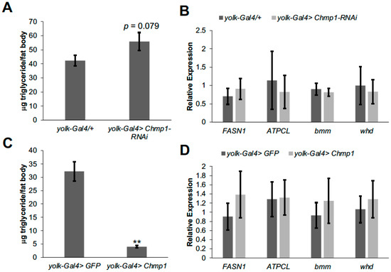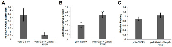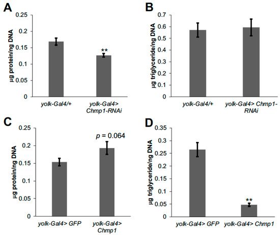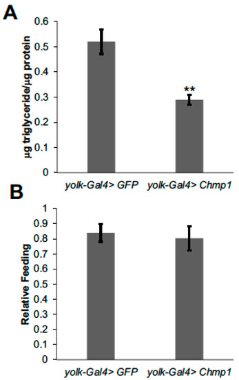 Overexpressing Chmp1 in the Drosophila fat body blunts triglyceride storage. (A) μg triglyceride/μg protein levels and (B) food consumption over 24 h were measured in 1-week-old yolk-Gal4>Chmp1 females and compared to yolk-Gal4>GFP controls. Bars indicate mean ± standard error. ** p < 0.01 by Student’s t test.